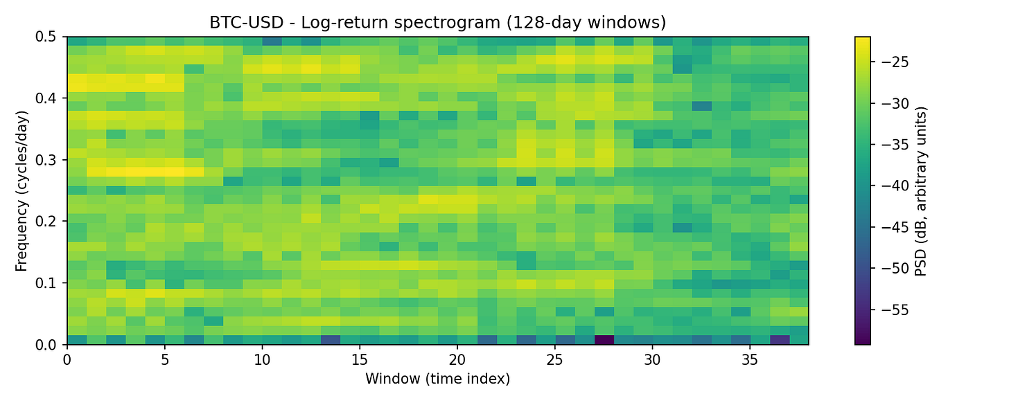 Instead, the heat map shows diffuse, shifting power which is typical of a stochastic process with volatility regimes, rather than a cyclical one. The “structure” in Bitcoin’s daily behavior comes from changes in volatility and trend, not from oscillatory components.