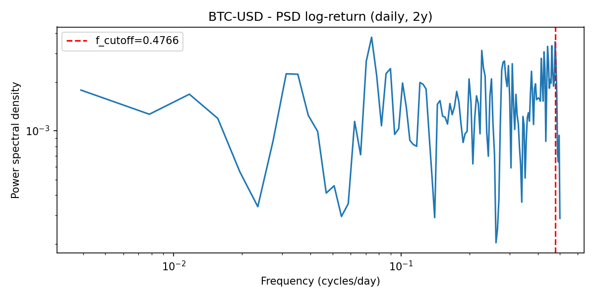 I ran a spectral analysis of Bitcoin using two years of daily log-return data. The goal was to identify whether the BTC/USD market exhibits any periodic structure: recurring rhythms, dominant cycles, or predictable frequency bands at the daily resolution.